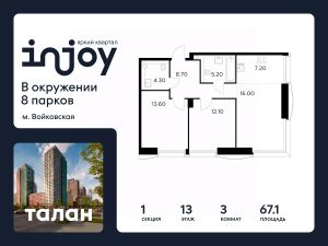 Прямая продажа от застройщика. В жилом квартале, расположенном в Войковском районе Москвы, продаётся 3-комнатная квартира площадью 67.1 кв.м без отделки. Квартира расположена на 13 этаже 35-этажного дома, корпус 1, в жилом квартале бизнес-класса INJOY.