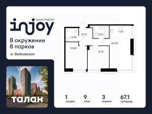 Прямая продажа от застройщика. В жилом квартале, расположенном в Войковском районе Москвы, продаётся 3-комнатная квартира площадью 67.1 кв.м без отделки. Квартира расположена на 9 этаже 35-этажного дома, корпус 1, в жилом квартале бизнес-класса INJOY.