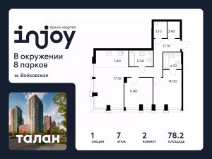 Прямая продажа от застройщика. В жилом квартале, расположенном в Войковском районе Москвы, продаётся 2-комнатная квартира площадью 78.2 кв.м без отделки. Квартира расположена на 7 этаже 35-этажного дома, корпус 1, в жилом квартале бизнес-класса INJOY.