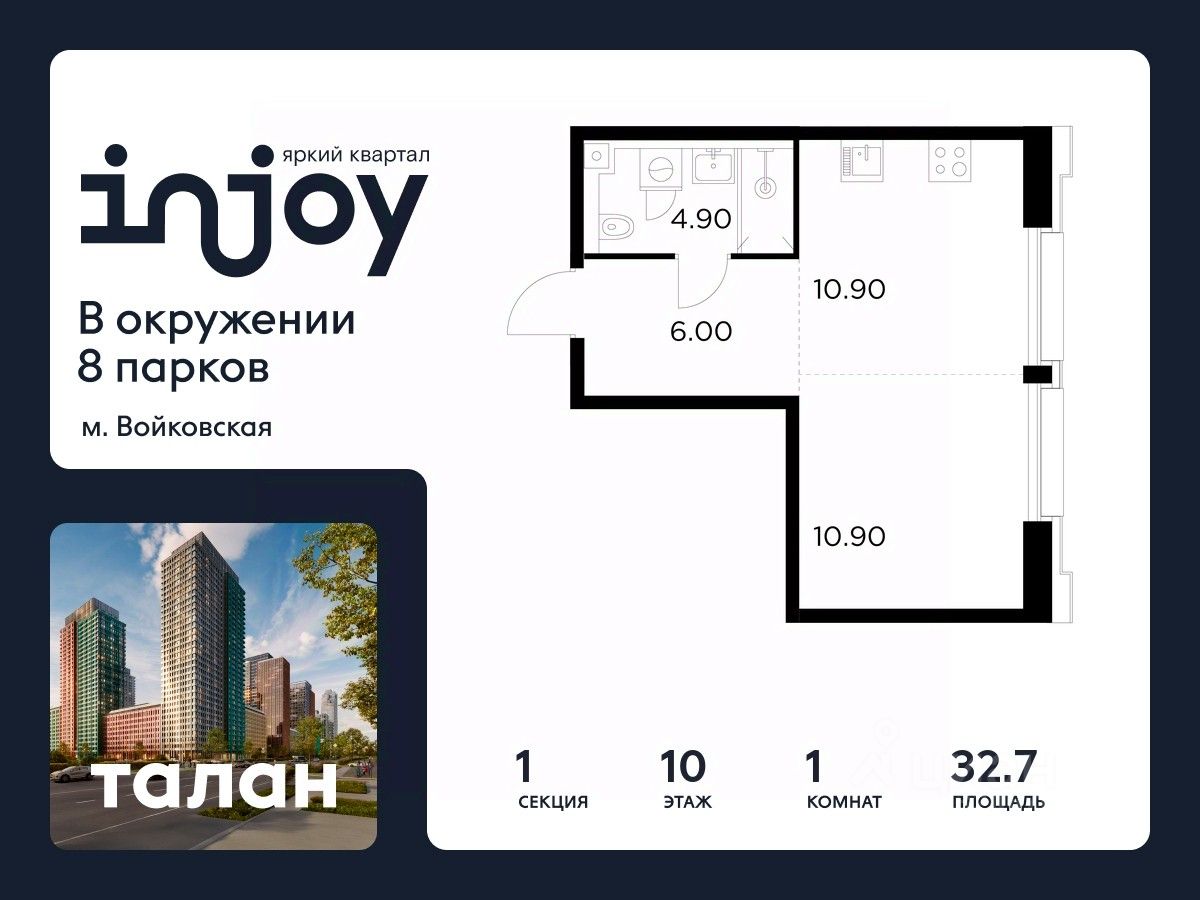 Прямая продажа от застройщика. В жилом квартале, расположенном в Войковском районе Москвы, продаётся 1-комнатная квартира площадью 32.7 кв.м без отделки. Квартира расположена на 10 этаже 35-этажного дома, корпус 1, в жилом квартале бизнес-класса INJOY.