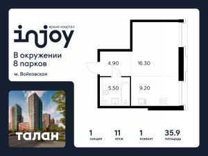 Прямая продажа от застройщика. В жилом квартале, расположенном в Войковском районе Москвы, продаётся 1-комнатная квартира площадью 35.9 кв.м без отделки. Квартира расположена на 11 этаже 35-этажного дома, корпус 1, в жилом квартале бизнес-класса INJOY.