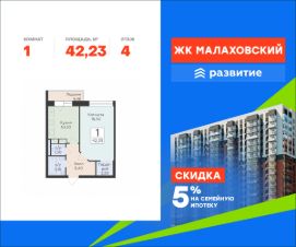 Продается 1-комнатная квартира площадью 42.23 с отделкой White box. Квартира расположена на 4 этаже 17 этажного дома, в 203 корпусе.