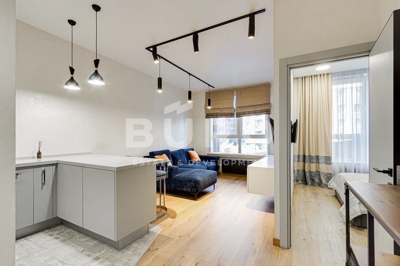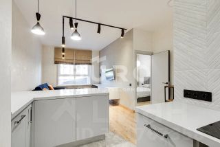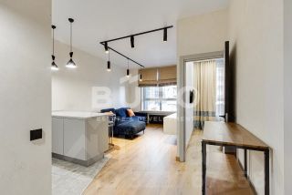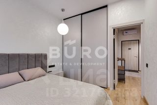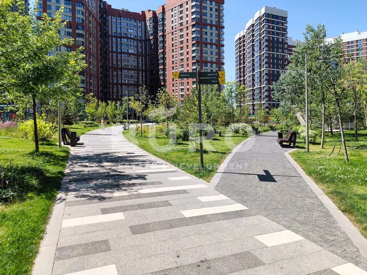 Функциональная планировка включает кухню-гостиную с обеденной зоной, спальню, санузел, гардеробную и прихожую. Из окон открываются виды на благоустроенную территорию комплекса.
