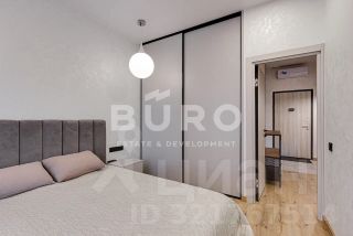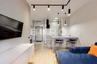 Функциональная планировка включает кухню-гостиную с обеденной зоной, спальню, санузел, гардеробную и прихожую. Из окон открываются виды на благоустроенную территорию комплекса.