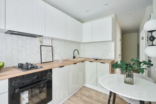 Просторная кухня оборудованная новой, современной техникой (холодильник, посудомоечная машина, духовой шкаф, вытяжка)