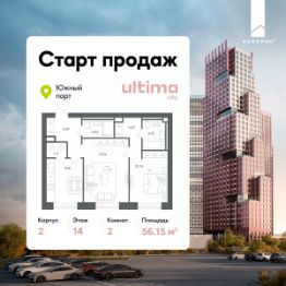 Старт продаж! Продаётся 2-комнатная квартира от застройщика ГК "КОРТРОС" в жилом комплексе бизнес-класса ULTIMAcity. Квартира расположена на 14 этаже 52 этажного корпуса 2. Общая площадь 56,15 м². Без отделки.