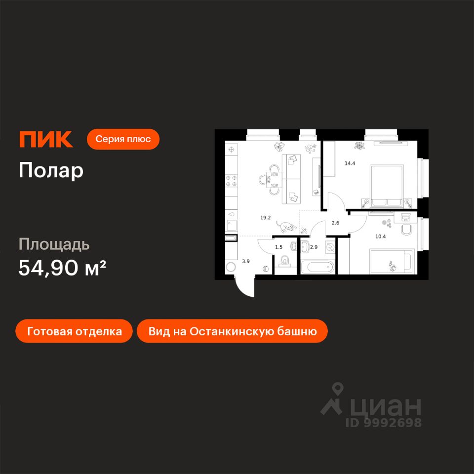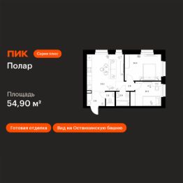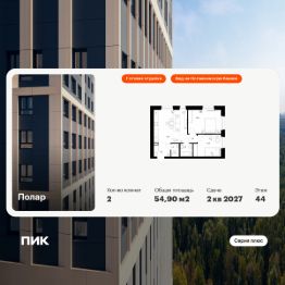 Продаётся 2-комн. квартира площадью 54,9 кв.м на 44 этаже 45 этажного дома (Корпус 1.4, Секция 1) проекта ПИК Полар. Светлый просторный подъезд на уровне земли, функциональная планировка, большие окна, c отделкой.