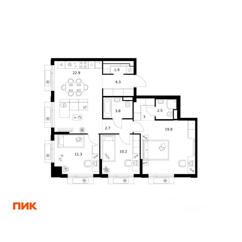 Продаётся 3-комн. квартира площадью 82,4 кв.м на 19 этаже 22 этажного дома (Корпус 1.1, Секция 1) проекта ПИК Алтуфьевское 53. Светлый просторный подъезд на уровне земли, функциональная планировка, большие окна, c отделкой.