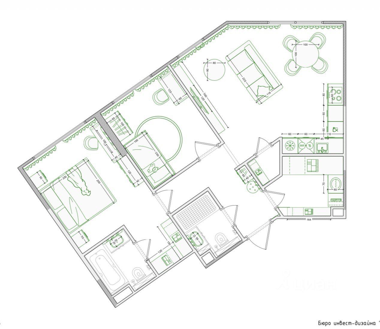 • 2 изолированные комнаты + кухня-гостиная