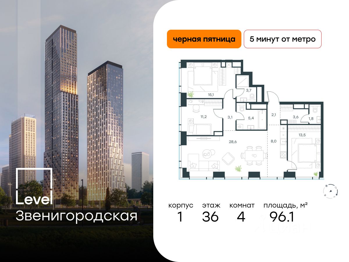 В престижном районе Хорошёво-Мнёвники продаётся 4-комнатная квартира площадью 96.10 кв.м white box. Квартира расположена на 36 этаже 48 этажного корпуса Корпус 1 в жилом комплексе класса комфорт+ Level Звенигородская (компания Level Group/Левел групп).