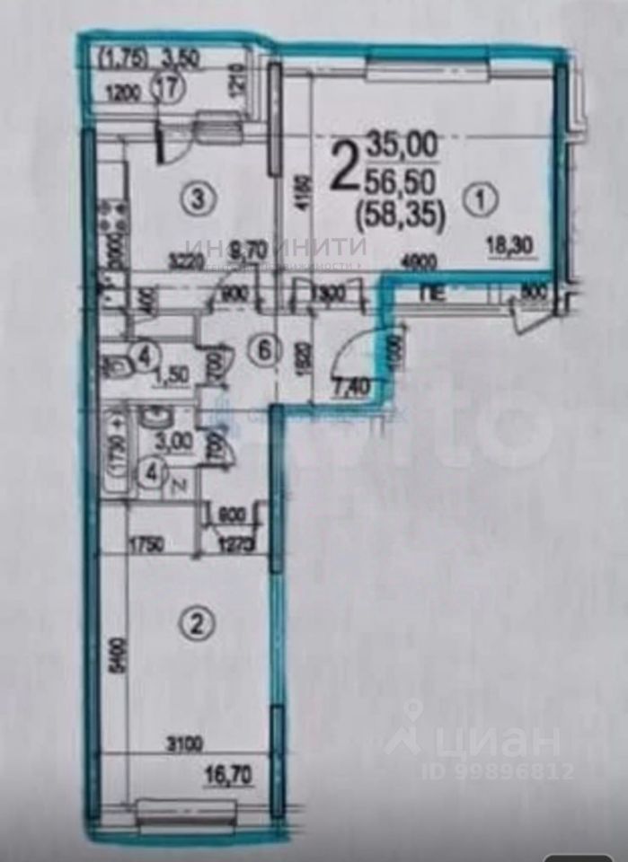 - площадь 56,5 кв.м. + балкон 1,75 кв.м.,