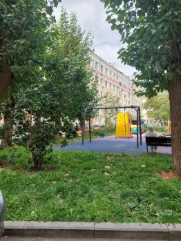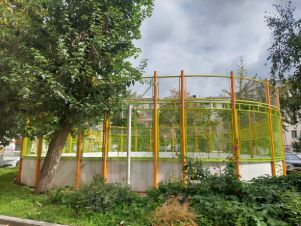 Вокруг дома уютная чистая территория с шлагбаумом для машин жильцов дома. На территории детская и спортивная площадки, деревья и цветы.