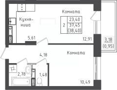 1-комн. квартира, 38,4 м²
