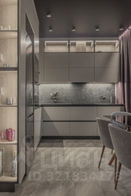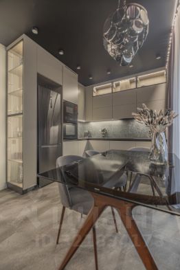 Кухня - гостиная 27.34 м². Кухня выполнена в эмали. Стеклянные верхние шкафы и боковой шкаф. Встроенная техника ( посудомоечная машина, микроволновка, варочная панель и духовой шкаф - фирмы Kuppersberg).