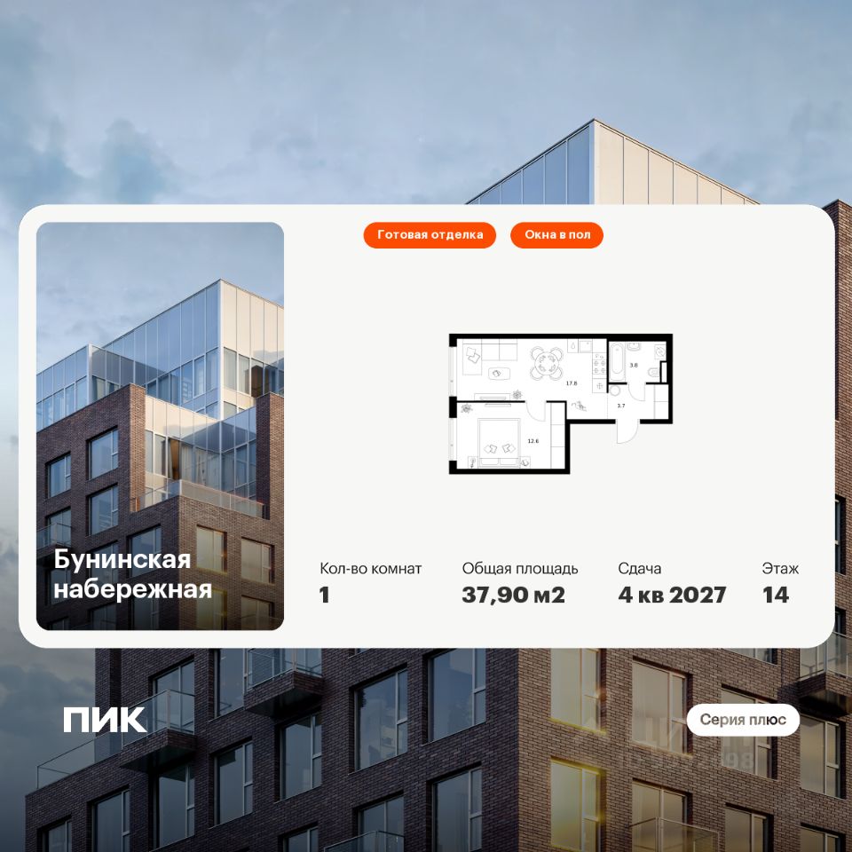 Продаётся 1-комн. квартира площадью 37,9 кв.м на 14 этаже 16 этажного дома (Корпус 2.6/1.1, Секция 1) проекта ПИК Бунинская набережная. Светлый просторный подъезд на уровне земли, функциональная планировка, большие окна, c отделкой.