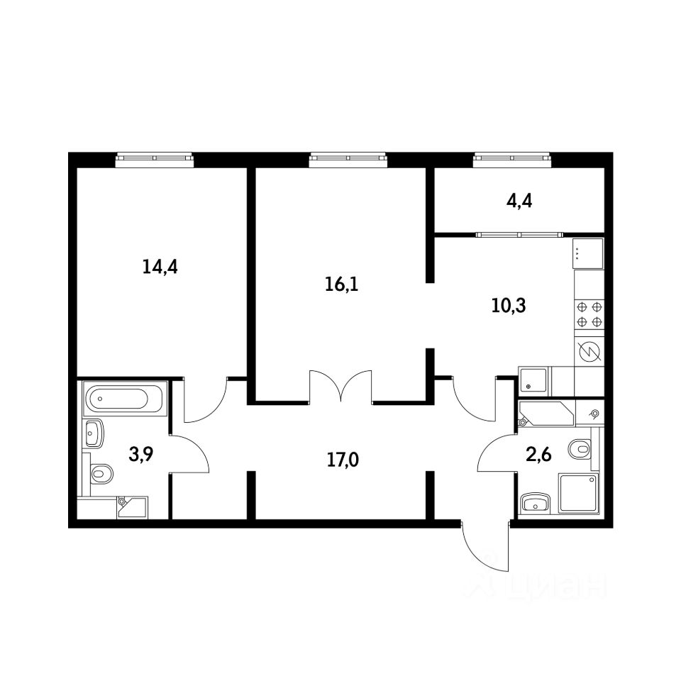 Квартира площадью 69,3 кв.м., 2 раздельные комнаты 14,4 и 16,1 кв. метров, кухня 15 кв. метров с зимним садом (это разграничение кухни и окна перегородкой, если ее демонтировать, то получится просторная кухня, если оставлять, как в проекте, то получается теплая лоджия или зимний сад).