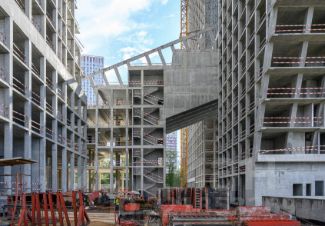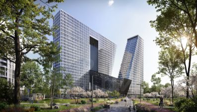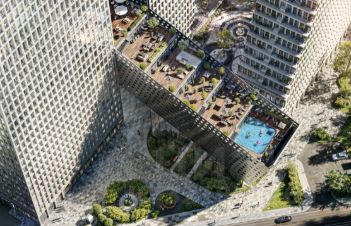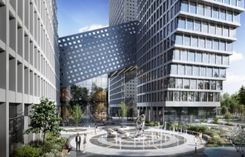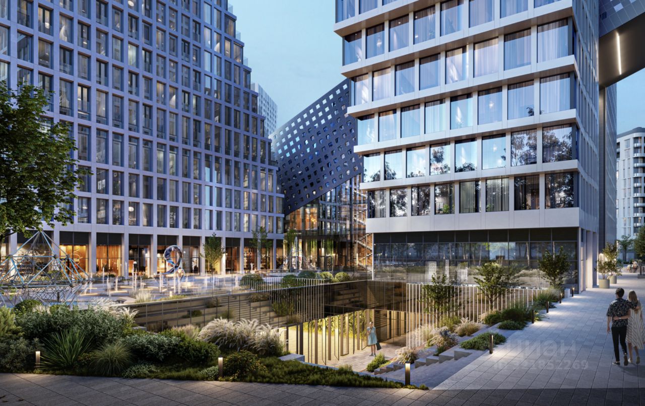 Территория комплекса благоустроена — собственный SPA-центр с открытым бассейном и панорамными видами на столицу, офисный центр с конференц-залом и амфитеатром, кафе, супермаркет, а также приватные общественные пространства для резидентов.