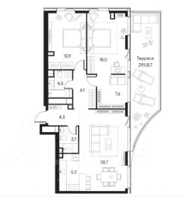 Квартира встречает просторным холлом в 10,4 кв.м. Кухня-гостиная 34 кв,м с выходом на террасу. Две спальни 15,9кв.м, и 18кв.м с выходом на террасу. Кабинет или большая гардеробная 7,6кв.м. Два совмещенных с/у, один с ванной 4,5кв.м, другой с душевой кабиной 3,7кв.м. Большая терраса 29,1кв.м с потрясающим видом на р. Москва.
