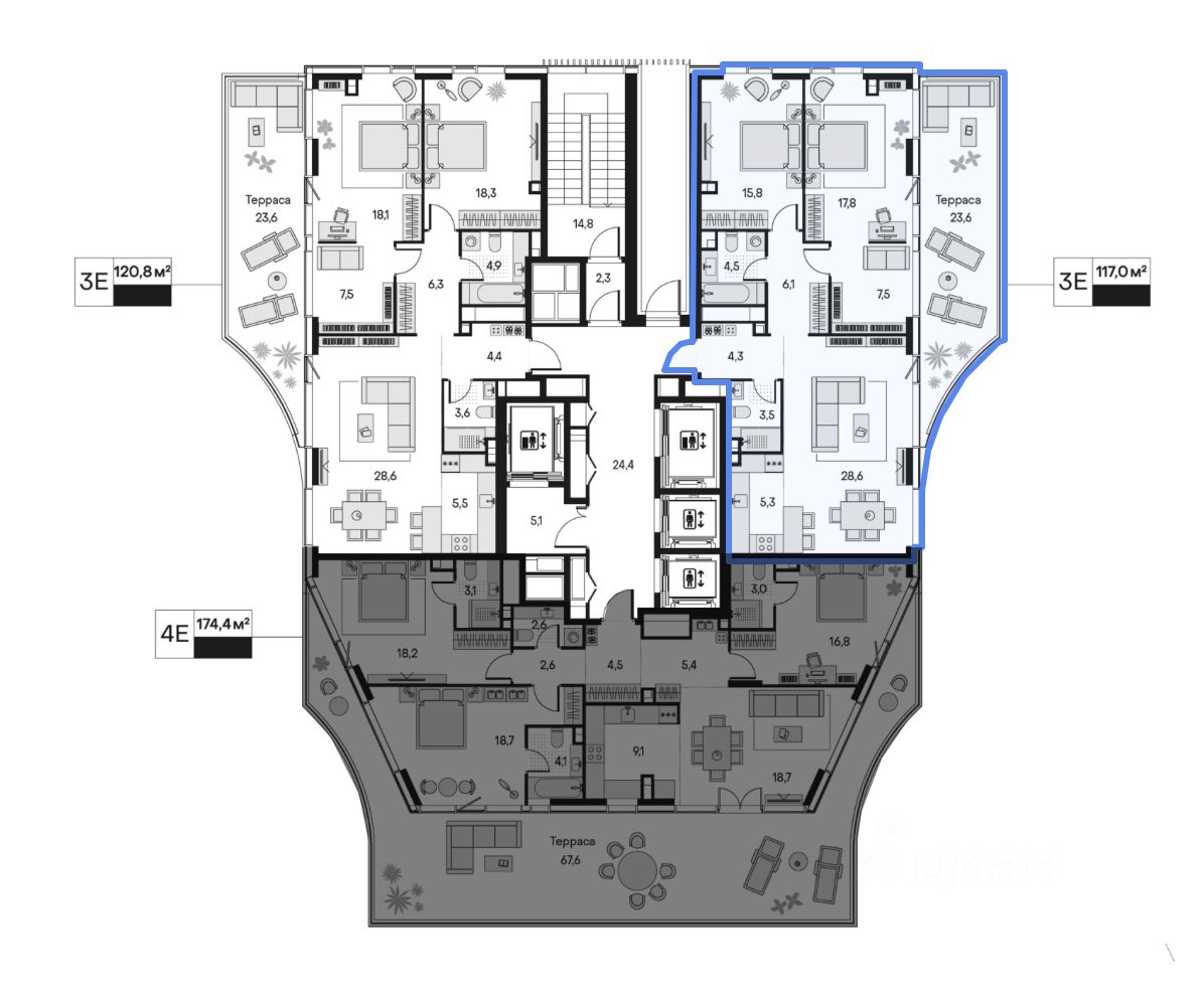 В жилом комплексе премиум-класса "Клубный город на реке Primavera" к покупке предлагается видовая квартира в планировке 3Е - 102,8кв.м на последнем 22 этаже.