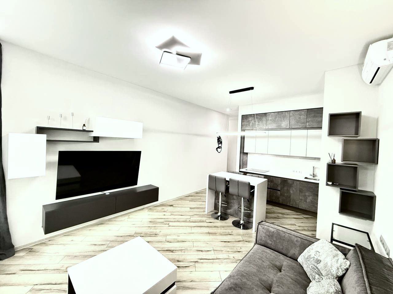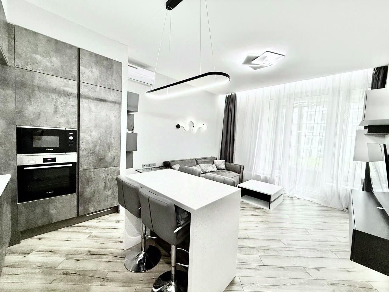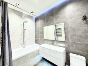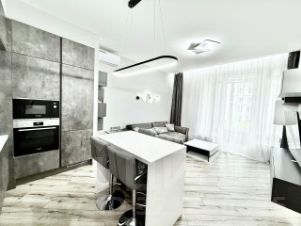 В квартире сделан дизайнерский ремонт, который сочетает в себе стиль и функциональность. Просторная кухня площадью 22.8 кв. м оснащена всей необходимой техникой: холодильник, посудомоечная машина, стиральная машина и кондиционер. Комнаты меблированы, а в одной из ванных комнат установлена ванна. Два совмещенных санузла обеспечивают дополнительное удобство.