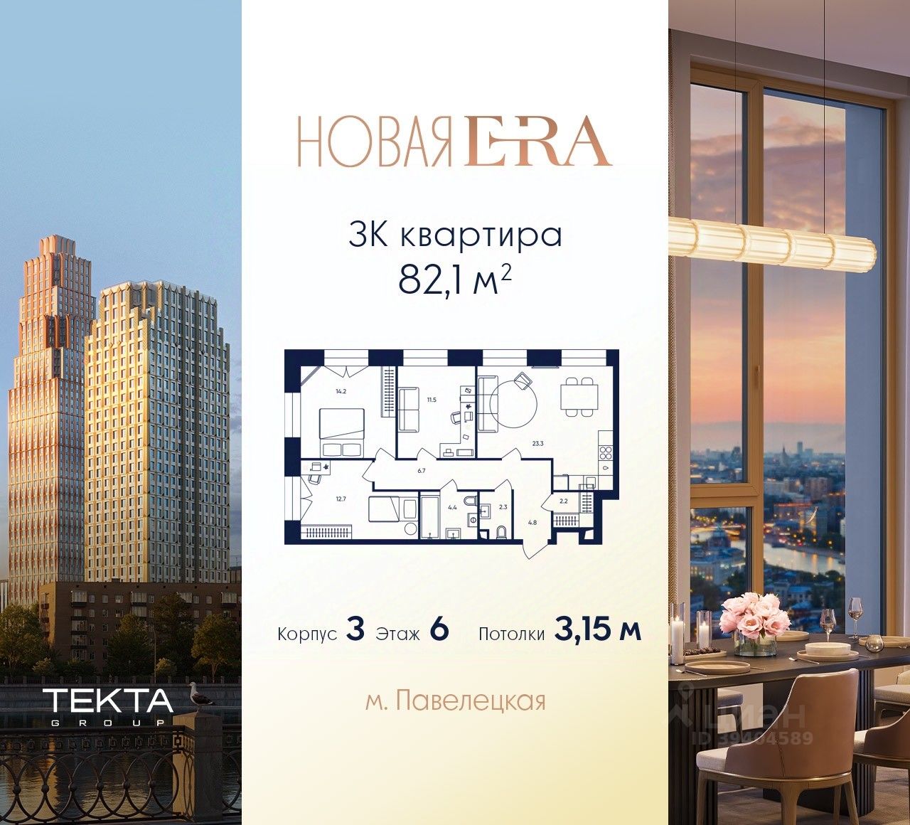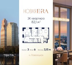 3-комн. квартира в ЖК "Era" на 6 этаже в 33 этажном здании Корпус 3. Общая площадь: 82.1 кв.м., жилая: 38.40 кв.м. Высота потолков 3.15 м.