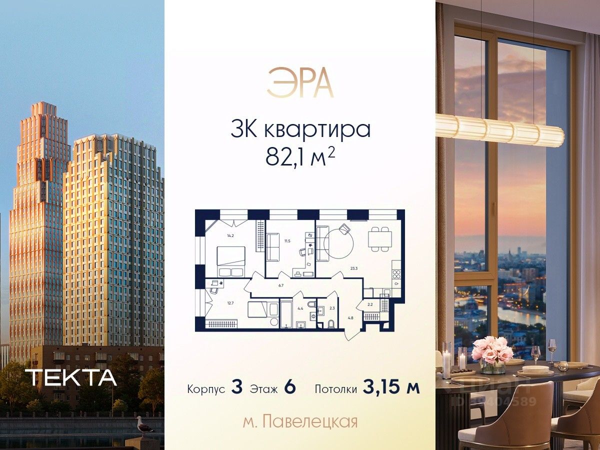 3-комн. квартира в ЖК "ЭРА" на 6 этаже в 33 этажном здании Корпус 3. Общая площадь: 82.1 кв.м., жилая: 38.40 кв.м. Высота потолков 3.15 м.