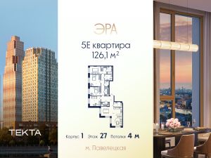 5-комн. квартира в ЖК "ЭРА" на 27 этаже в 27 этажном здании Корпус 1. Общая площадь: 126.1 кв.м., жилая: 75.80 кв.м. Высота потолков 4.00 м.