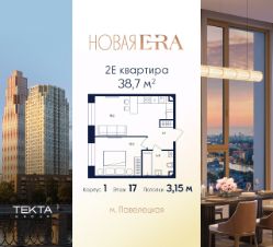 2-комн. квартира в ЖК "Era" на 17 этаже в 27 этажном здании Корпус 1. Общая площадь: 38.7 кв.м., жилая: 22.60 кв.м. Высота потолков 3.15 м.