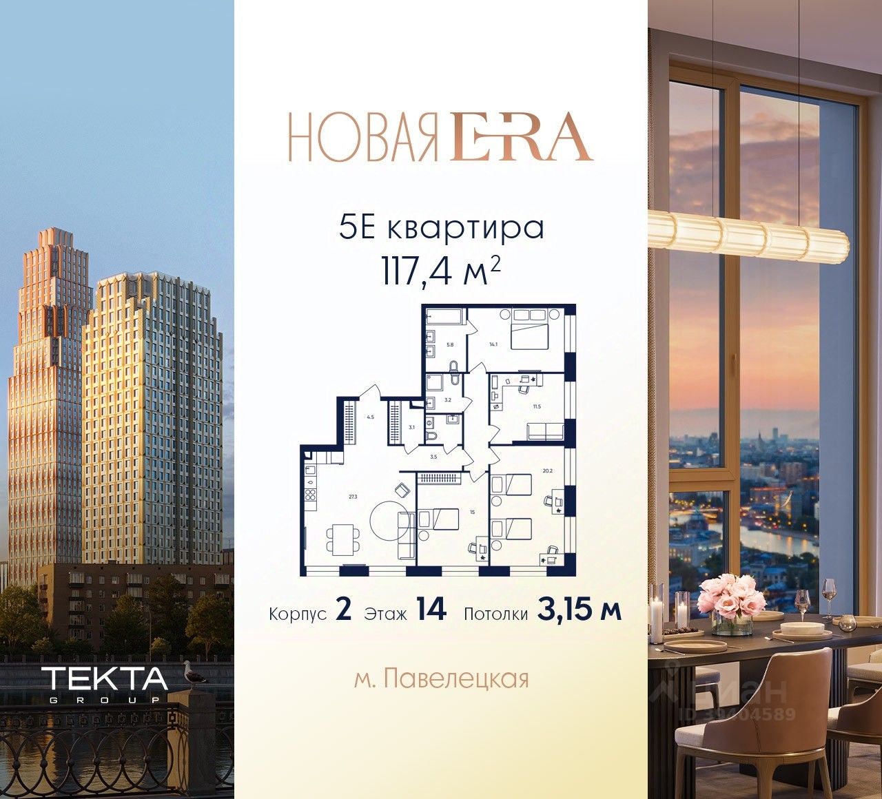 5-комн. квартира в ЖК "Era" на 14 этаже в 32 этажном здании Корпус 2. Общая площадь: 117.4 кв.м., жилая: 79.30 кв.м. Высота потолков 3.15 м.