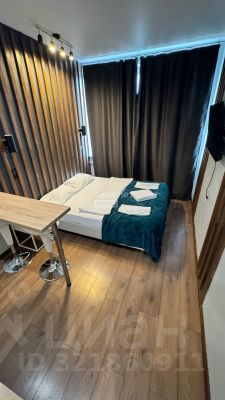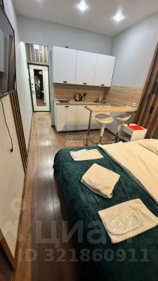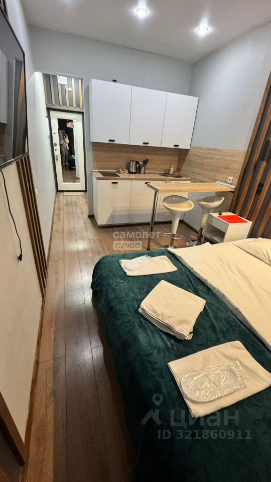В комнате удачно размещены кухня, большая кровать, стол, барные стулья, тумбочка и телевизор, имеется санузел с душевой кабиной. Все пространство организовано максимально функционально, без излишеств, что создает ощущение свободы и простора.