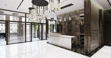 В холлах предусмотрена лаунж-зона с дизайнерской мебелью, камином, люстрами и отделкой с применением трёх видов мрамора, латуни и американского ореха.