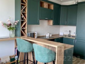 Кухня-гостиная: Функциональный гарнитур от фабрики "Мария" с увеличенным объемом систем хранения. Вся встроенная техника (варочная панель, духовой шкаф, холодильник, кондиционер) остается новому владельцу. Планировочное решение было разработано при участии шеф-повара.