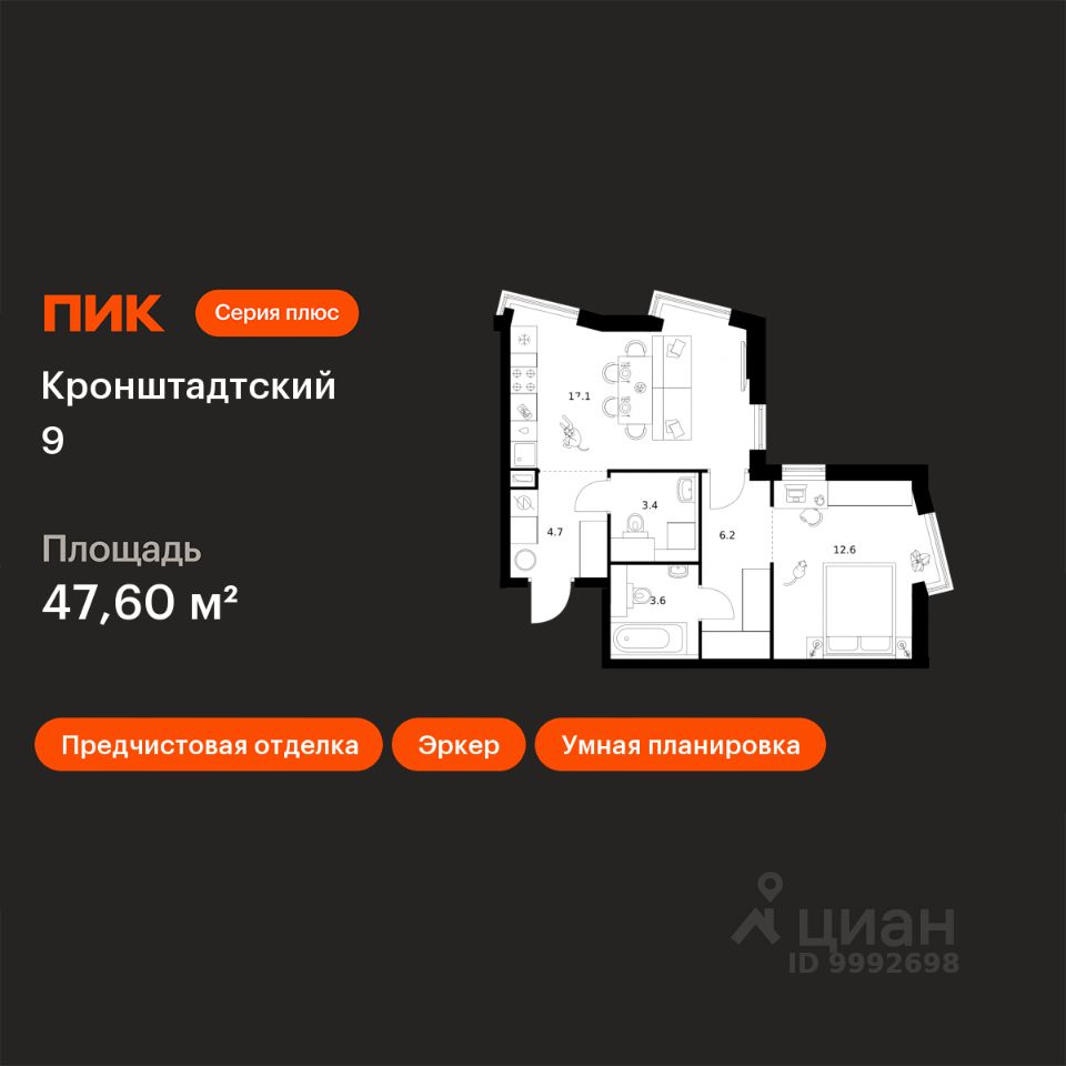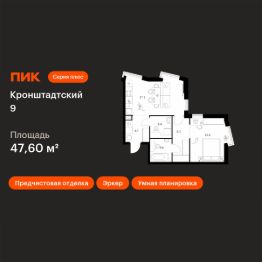 Продаётся 1-комн. квартира площадью 47,6 кв.м на 30 этаже 32 этажного дома (Корпус 1.1.3, Секция 3) проекта ПИК Кронштадтский 9. Светлый просторный подъезд на уровне земли, функциональная планировка, большие окна, предчистовая отделка.