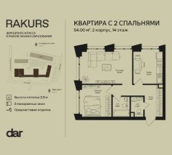 Продаётся 2-комнатная квартира 54.00 м² в жилом комплексе Ракурс. Квартиру отличают панорамное остекление, потолки 2,9 м, улучшенная шумо и воздухоизоляция. Дом сдаётся в 1 квартале 2028 года, продажи проходят через эскроусчета. Подземный паркинг, коворкинг, закрытая благоустроенная территория с фонтаном и артобъектами. Гибкие условия покупки. Rakurs — место, в котором жизнь приглашает к исследованию. Концепция проекта knowledge-centric среда, которая выражается здесь в образе жизни: • атмосфере интеллектуальной среды, • доступности образования, • фокусе на возможности для развития. RAKURS разместился в районе науки и окружен исследовательскими институтами и образовательными учреждениями, при этом на территории построена своя школа с уникальной концепцией. Расположенный на пересечении улиц Маршала Бирюзова и Берзарина, недалеко от станций метро "Октябрьское поле" и "Зорге", дом угождает транспортной доступностью автомобилистам и пешеходам. Инфраструктура же района создана с заботой о людях: здесь много парков, кафе и других уютных мест для отдыха. В состав комплекса входят три башни высотой 18, 26 и 44 этажа, каждая из которых имеет свой запоминающийся силуэт. Между собой башни связаны среднеэтажными строениями с индивидуальными фасадами. Композиция и пластика корпусов, а также панорамное остекление башен обеспечивают квартиры максимальным количеством дневного света и выигрышными видами на центр города и Москву-Сити. Упор на функциональность не лишает проект его уникального образа — все башни имеют неординарную форму с харизматичными уступами и консолями. Rakurs предлагает широкий выбор уникальных вариантов жилья — от студий до эксклюзивных квартир с приватными террасами. Проект спроектирован с фокусом на биофильность и функциональность. Во дворах Rakurs можно насладиться завтраком на террасе кафе, игрой с детьми или спортом на свежем воздухе. В Rakurse cвой комьюнити-центр - многофункциональное пространство для работы, отдыха, общения и развития. Одна из важнейших частей центра — частная библиотека с лаундж-зоной. Книжный фонд отбирается для нее кураторской командой, а дизайн пространства сделан так, чтобы жители могли почувствовать умиротворяющую атмосферу библиотечного зала. Идея knowledge-centric среды поддерживается здесь и книжным магазином с лекторием, а также зонами для самостоятельной учебы и занятий с преподавателями.