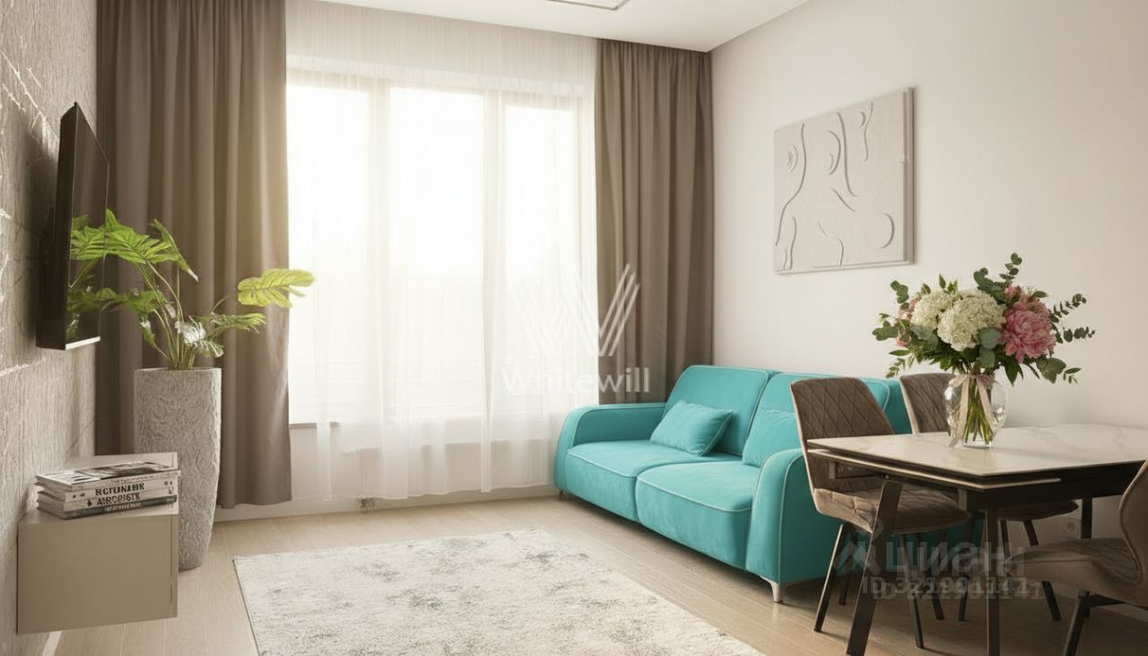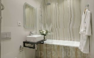 В квартире выполнена дизайнерская отделка в светлых лаконичных тонах. В оформлении использованы фактуры мрамора и дерева. Установлена индивидуальная система кондиционирования. Квартира полностью готова к проживанию: меблирована и укомплектована бытовой техникой Kuppersberg и Weissgauff.