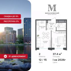 Продаётся 2-к квартира 37,4 кв.м. в ЖК "Михалковский" на 12-м этаже 15 этажного дома.