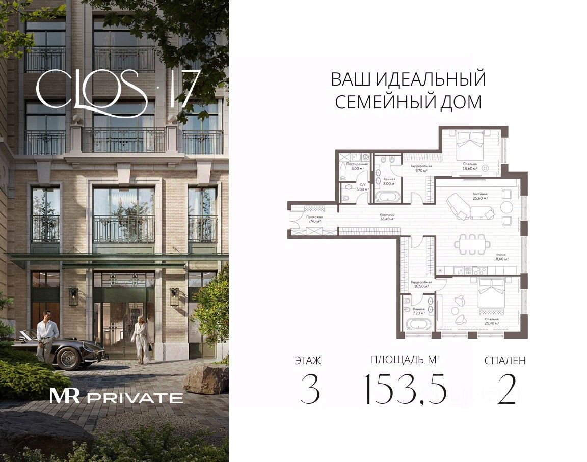 Clos 17 — клубный дом делюкс-класса от MR Private в Староваганьковском переулке. В проекте — 26 квартир площадью от 97 до 232 м² и два пентхауса с террасами, открывающими панораму на Кремль и Храм Христа Спасителя. Интерьеры вдохновлены парижскими ателье, но адаптированы к ритму Москвы — функциональные, просторные и изысканные.