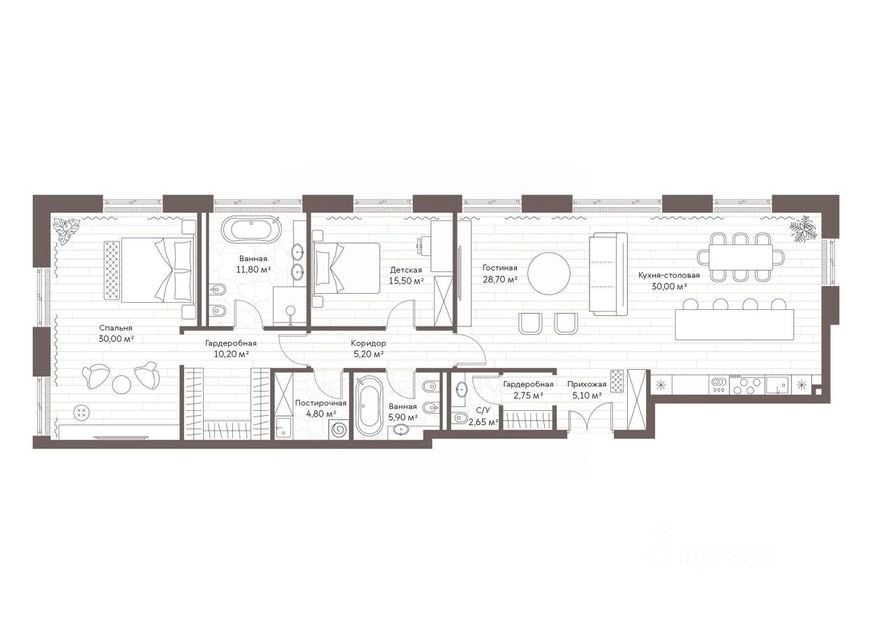 Продаётся 2-комнатная квартира общей площадью 152.55 м² без отделки на 4 этаже клубного дома в центре Москвы.