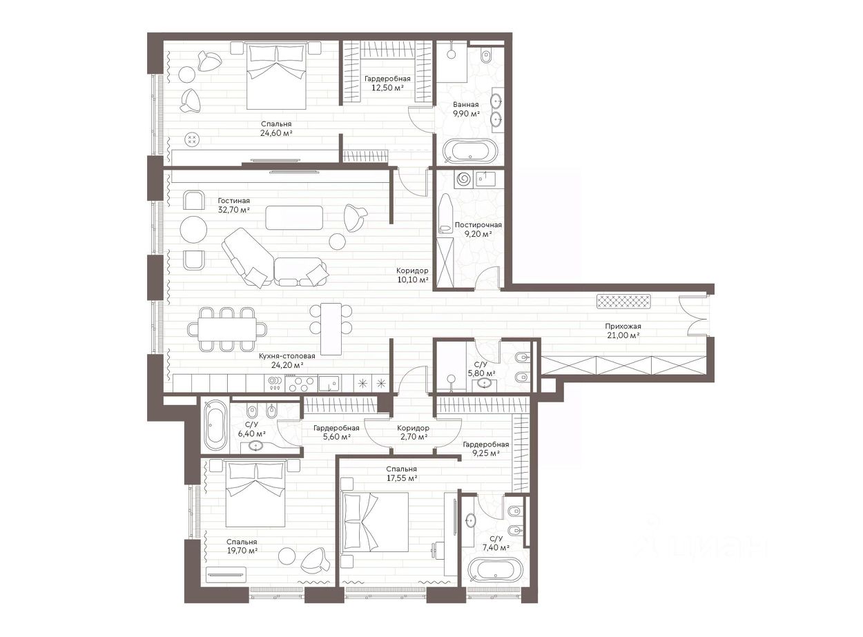 Продаётся 3-комнатная квартира общей площадью 217.70 м² без отделки на 4 этаже клубного дома в центре Москвы.
