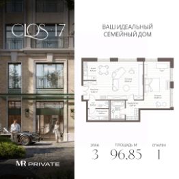 Продаётся 1-к квартира общей площадью 96.85 м² без отделки на 3 этаже клубного дома в центре Москвы.