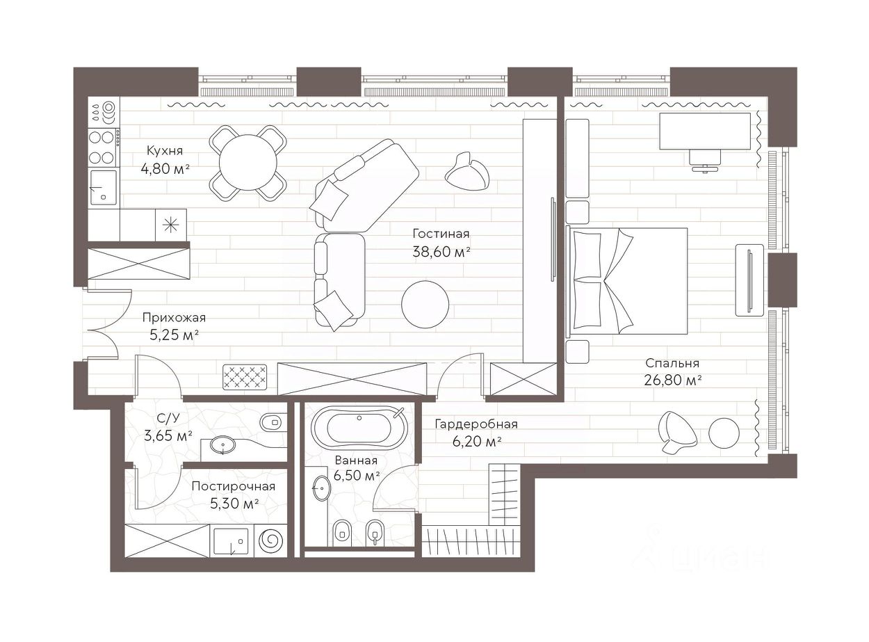 Каждая резиденция предлагает просторные планировки с высокими потолками до 3,5 метров, панорамными окнами с видами на Кремль и Храм Христа Спасителя, а также возможность адаптации под индивидуальные запросы будущего владельца.