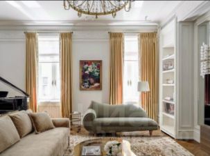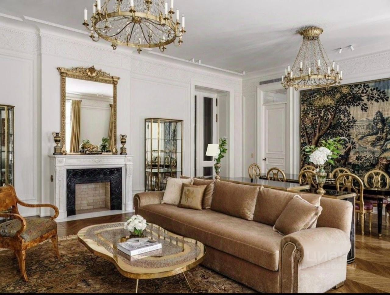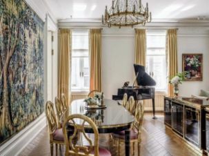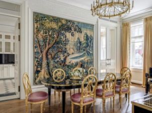 Изысканный дизайн квартиры воплощает в себе безупречное сочетание современного комфорта и исторической ценности. Каждая деталь интерьера продумана до мелочей: эксклюзивная мебель, изготовленная по индивидуальным проектам, винтажные элементы декора, гармонично вписанные в современный интерьер, благородные материалы отделки (мрамор, красное дерево, позолота), шелковые обои ручной работы, гобелены XVIII века, антикварные люстры, создающие особую атмосферу.