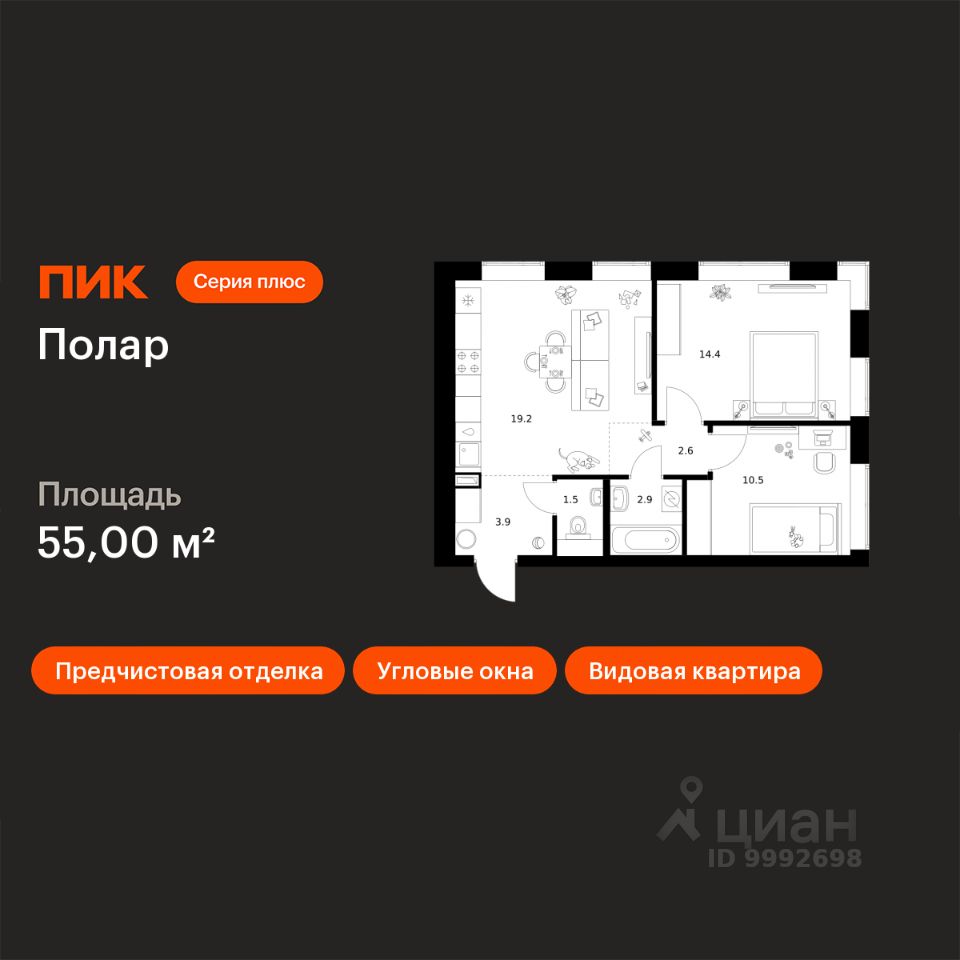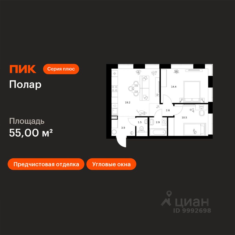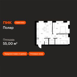 Продаётся 2-комн. квартира площадью 55 кв.м на 4 этаже 50 этажного дома (Корпус 1.5, Секция 2) проекта ПИК Полар. Светлый просторный подъезд на уровне земли, функциональная планировка, большие окна, предчистовая отделка.
