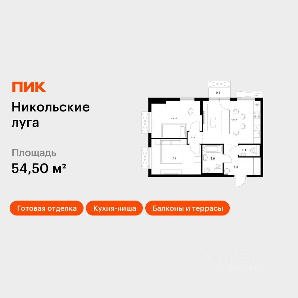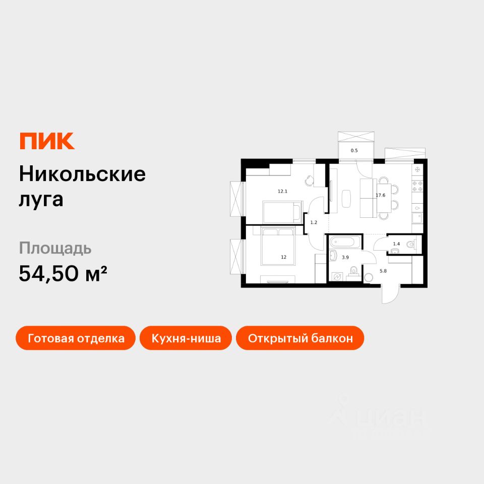 Продаётся 2-комн. квартира площадью 54,5 кв.м на 4 этаже 17 этажного дома (Корпус 4, Секция 3) проекта ПИК Никольские луга. Светлый просторный подъезд на уровне земли, функциональная планировка, большие окна, c отделкой.