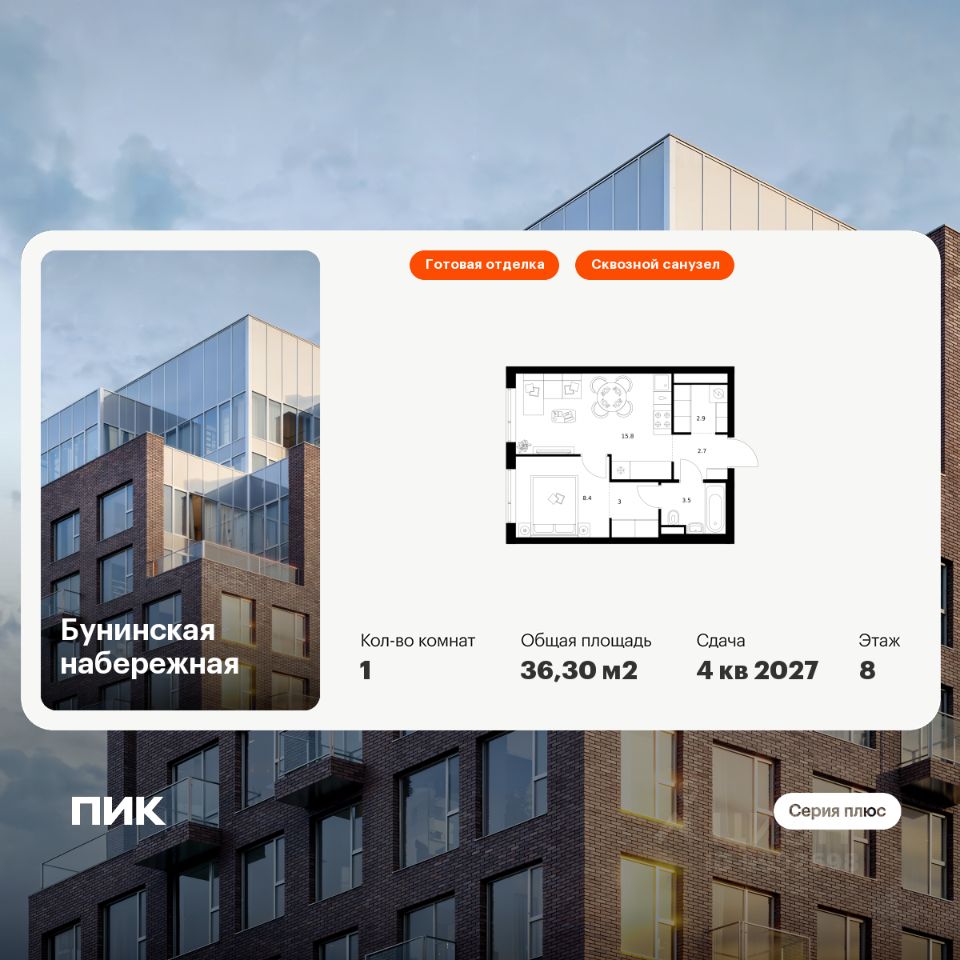 Продаётся 1-комн. квартира площадью 36,3 кв.м на 8 этаже 16 этажного дома (Корпус 2.6/1.4, Секция 4) проекта ПИК Бунинская набережная. Светлый просторный подъезд на уровне земли, функциональная планировка, большие окна, c отделкой.