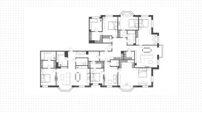 Возможно спланировать гостиную, кухню-столовую, четыре спальни, санузлы, гардеробные, постирочную, кладовую и холл.