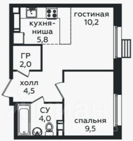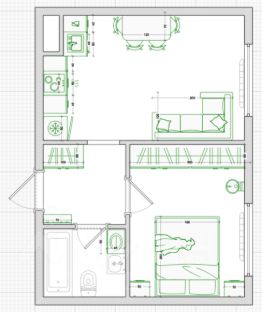 По планировке застройщика в квартире есть гардеробная, совмещенный санузел, спальня и кухня-гостиная.