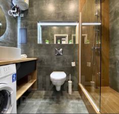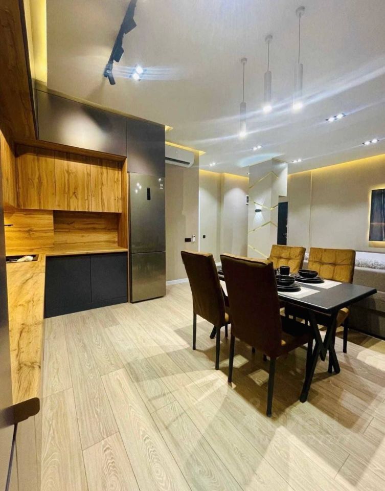 Апартаменты с качественным евроремонтом и продуманной планировкой. Интерьер выдержан в современном стиле, который создает уютную и комфортную атмосферу. В квартире есть два совмещенных санузла, что очень удобно для семьи или гостей. Все необходимое для жизни уже есть: мебель, бытовая техника и стильные элементы декора.