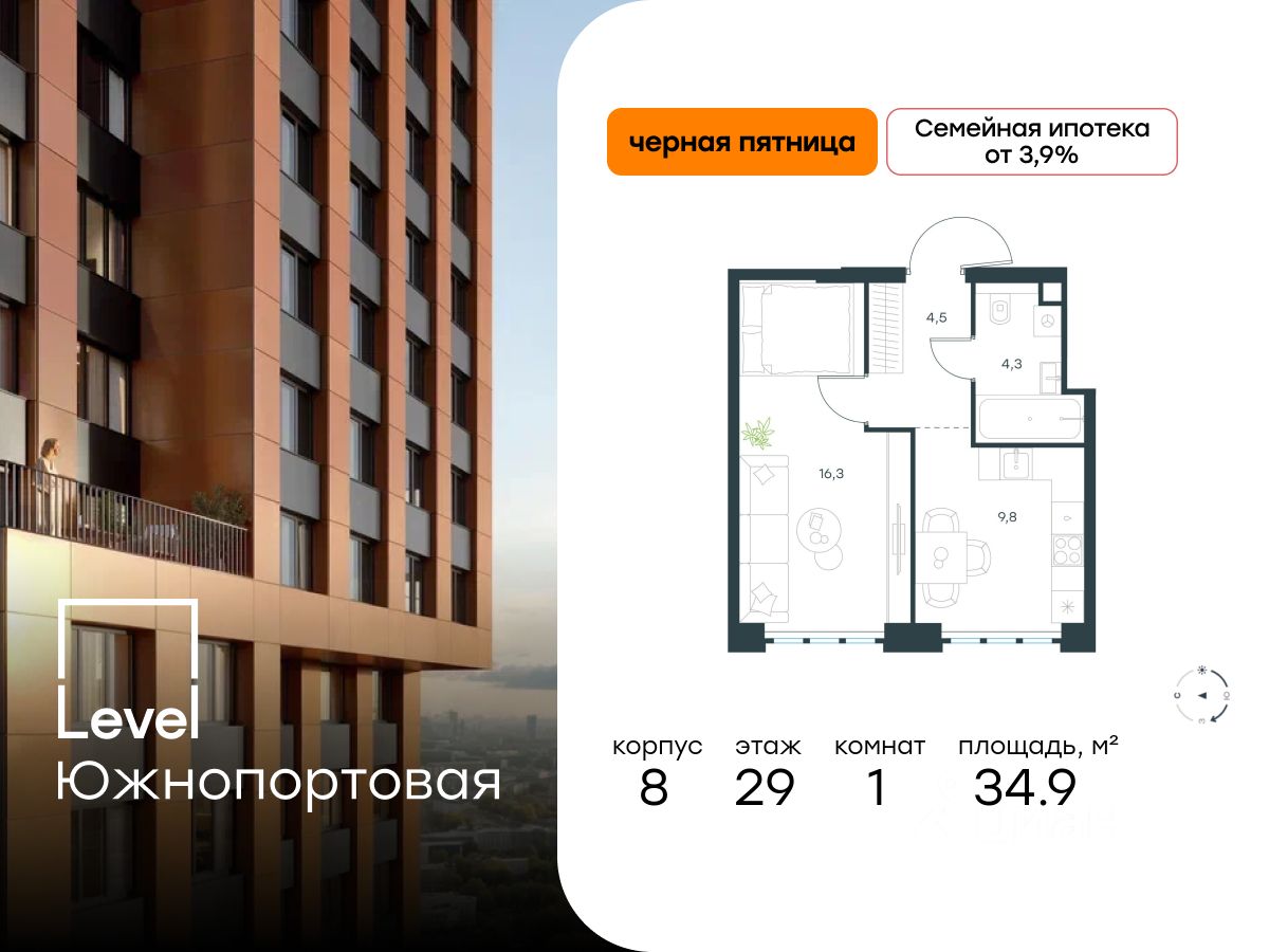 В северной части района Печатники продается 1-комнатная квартира площадью 34.90 кв.м без отделки. Квартира расположена на 29 этаже 49-этажного корпуса Корпус 8 в жилом комплексе комфорт-класса Level Южнопортовая (компания Level Group/Левел групп).