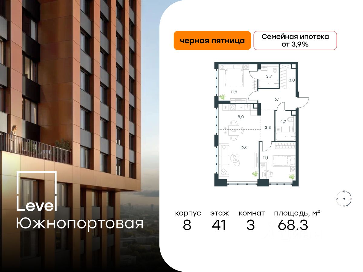 В северной части района Печатники продается 3-комнатная квартира площадью 68.30 кв.м без отделки. Квартира расположена на 41 этаже 49-этажного корпуса Корпус 8 в жилом комплексе комфорт-класса Level Южнопортовая (компания Level Group/Левел групп).
